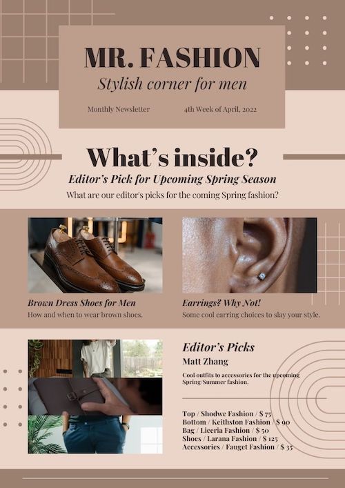 This short editable newsletter template will help to keep your subscribers informed about the latest fashion trends. The layout offers plenty of space for photos, catchy headlines, and highlights. Its light brown palette looks modern and appeals to readers of all genders.