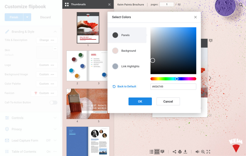 With the Color Palette, you can select the color for Panels, Background, and Link Highlight for your flipbook. Here is how you can do that: