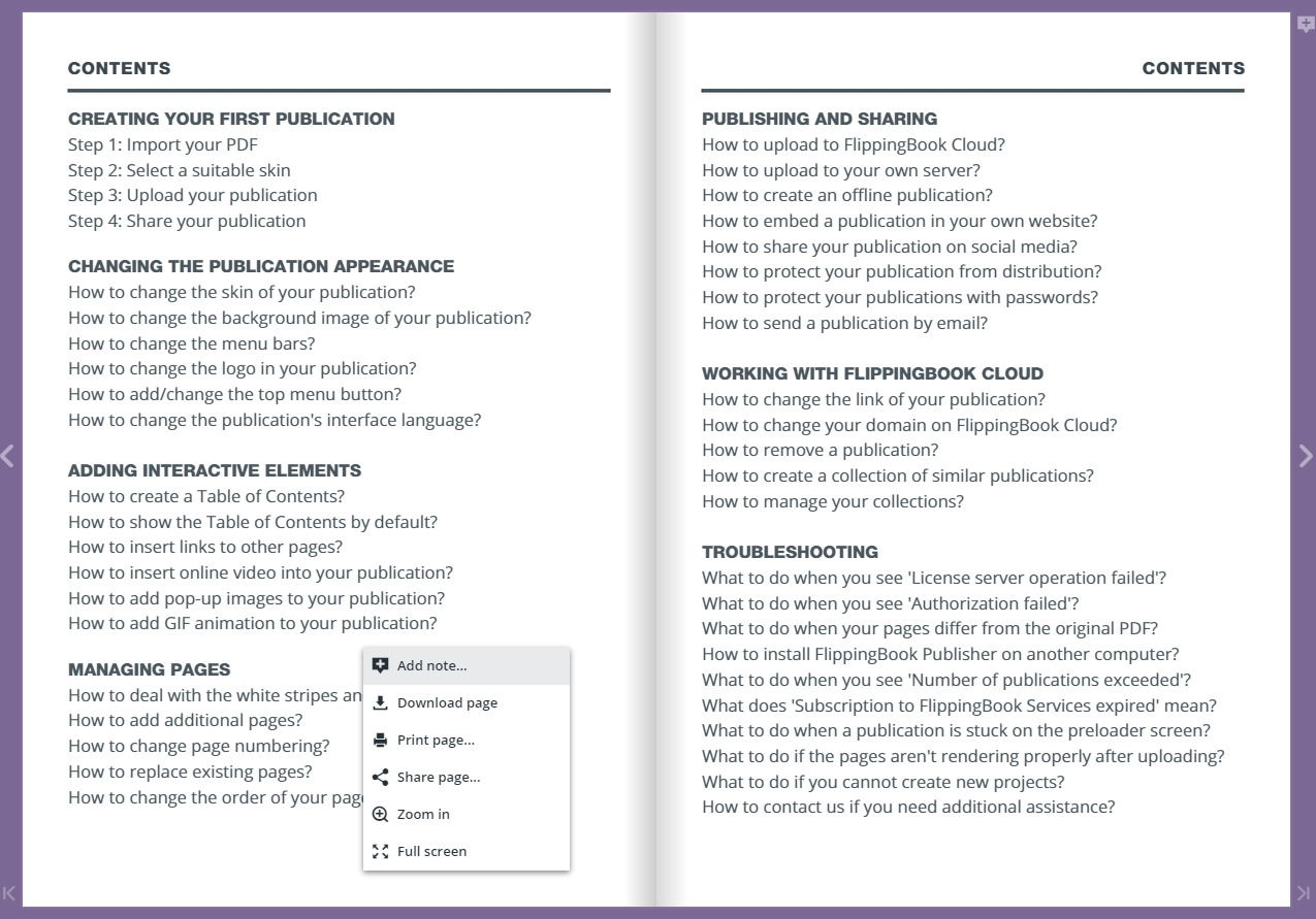 The downside is, that some of the functionality that the menu bars offer becomes inaccessible, though your readers can still right-click on the pages to bring up a menu with some of the more important options: adding notes, printing, downloading and sharing, zoom and full screen. But if functionality like ‘search’ or ‘table of contents’ is crucial, then be mindful of what you remove!