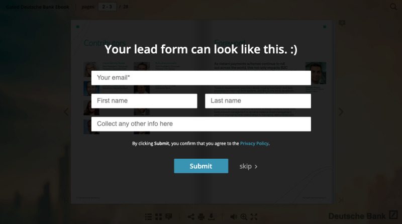 If you use magazine previews as a lead generation technique, FlippingBook can help. You can place a lead collection form on any page of your magazine to encourage people to sign up for more.