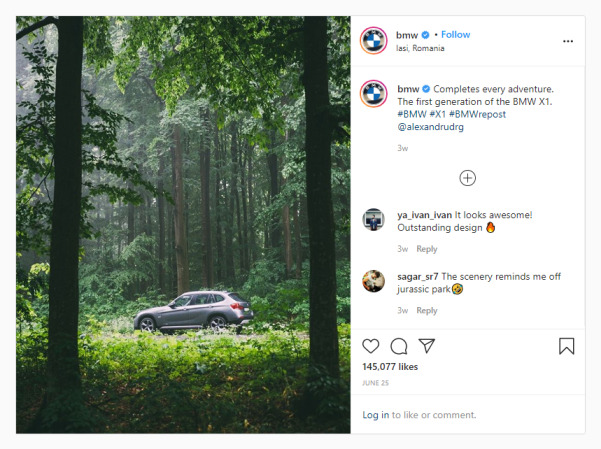 Let’s look at BMW's user-generated content examples. They run a hashtag campaign called #BMWrepost and let customers publish and share photos of their cars. Then, BMW reposts user-generated content on their page. As a result of this campaign, BMW has reached 27.6M Instagram followers and is the most successful automotive brand on Instagram.