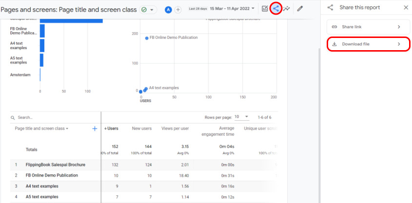 At first, it looks like the same data, only in a table. But you can break it down by adding a second column, just like we broke down acquisition data in the previous paragraph. If you want to know the detailed geographical distribution of a specific flipbook, you can